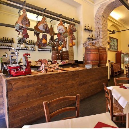 La Fraschetta romanesca a via Tacito si struttura su due piani. Il primo con pochi tavoli, un paio anche esterni, ospita un bancone di salumi e formaggi in esposizione al cliente, l’altro, il piano sotterraneo, ha un’ampia sala che ospita la maggior parte dei coperti. Immancabile l’arredamento tipico da osteria: botti di vino decorano l’ambiente, sedie e tavoli in legno, tovagliette di carta usa e getta per ogni commensale.