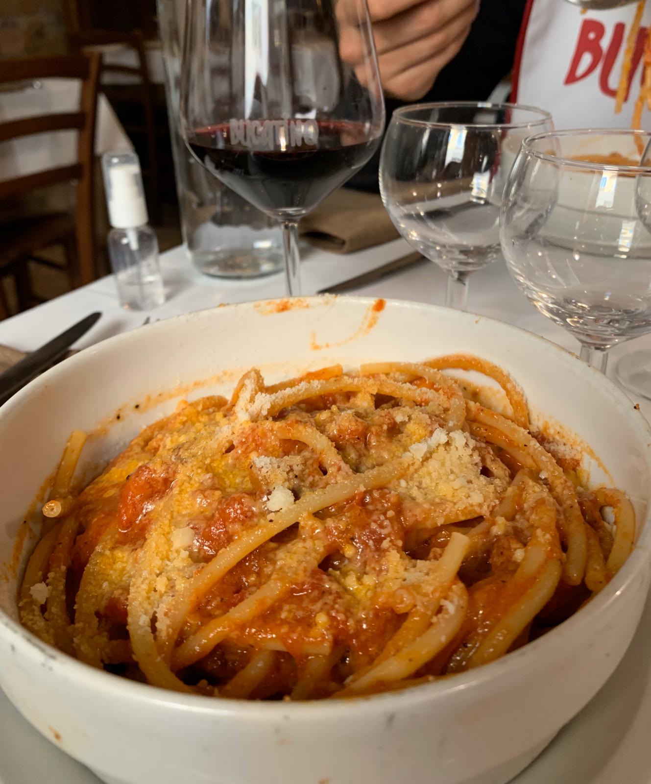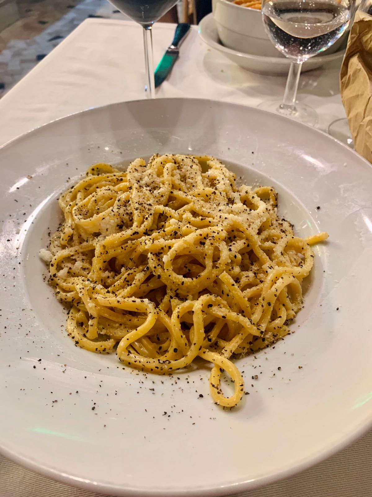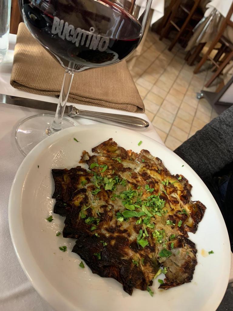 Tra le proposte del menu, vogliamo evidenziare i piatti tipici romani, in particolare i bucatini alla amatriciana (12 euro) e i tonnarelli cacio e pepe (13 euro) che abbiamo avuto il piacere di assaggiare. Entrambi i piatti ci sono sembrati genuini, con un buon sapore e un ottimo condimento. Seppur abbondanti, li abbiamo finiti in un boccone! Non potete non assaggiarli! Il tutto era accompagnato da un buon vino e una deliziosa focaccia. Immancabili anche i carciofi alla piastra, una delicata e gustosa specialità del locale.