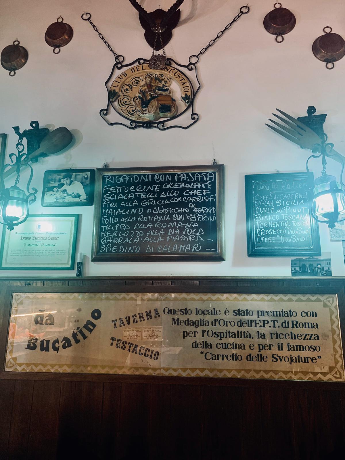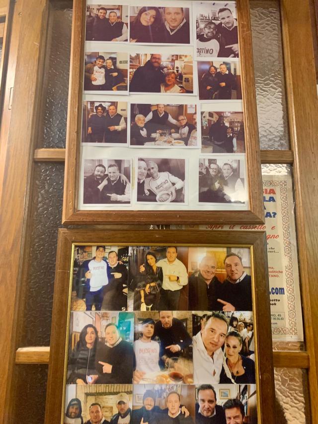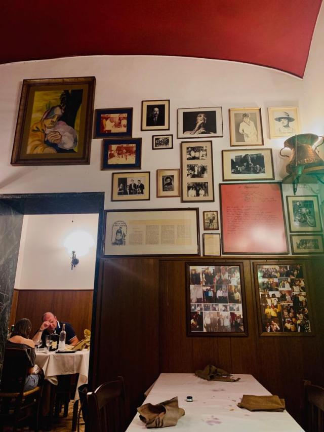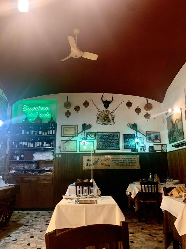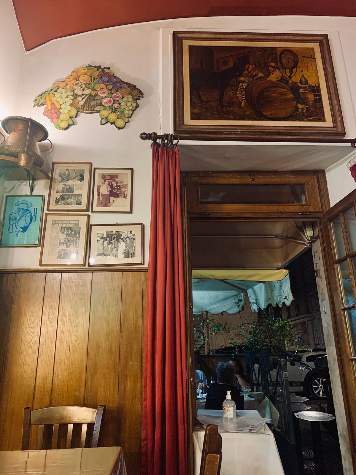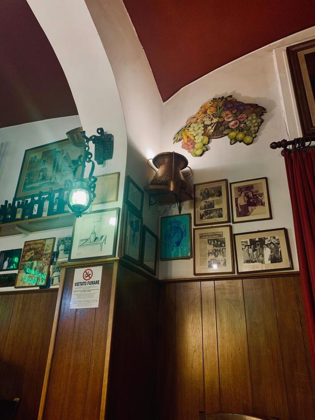 Così come ci aspettavamo da un locale di questo tipo, l’ambiente ci è sembrato fin da subito accogliente e familiare per l’aspetto tipicamente da taverna, con pareti rivestite in legno, bottiglie di vino a vista, sedie e tavoli di legno, lavagnette con i piatti consigliati, vari oggetti appesi che richiamano un po’ il passato, così come bacheche e vecchie foto, tra cui non mancano proprio all’ingresso quelle con i numerosi personaggi famosi (es. Sarah Jessica Parker, Pierfrancesco Favino, Checco Zalone ecc.) che hanno visitato il locale nel corso degli anni. Alle varie sale interne si aggiunge anche uno spazio all’aperto, molto apprezzato d’estate e di conseguenza molto richiesto.