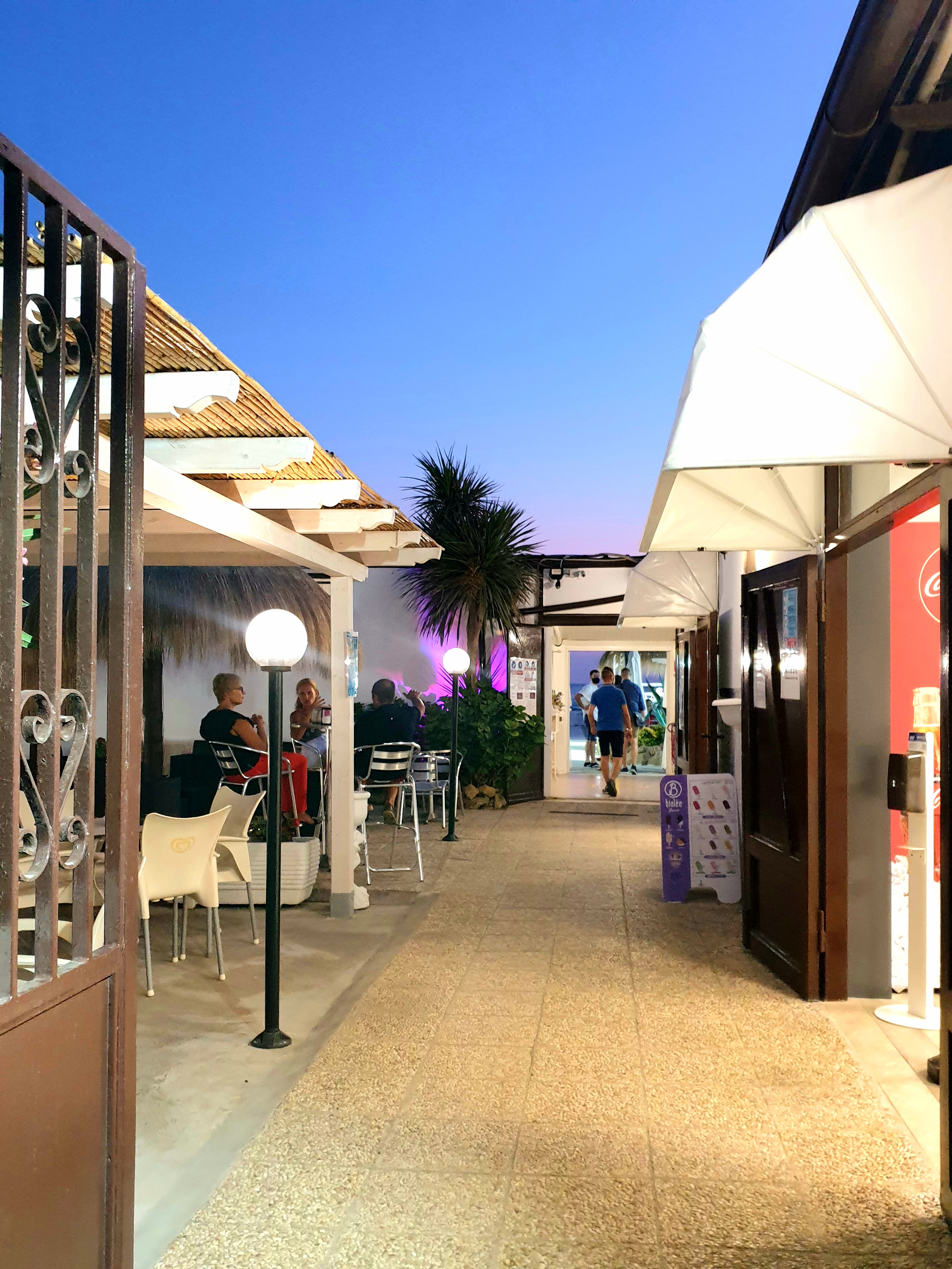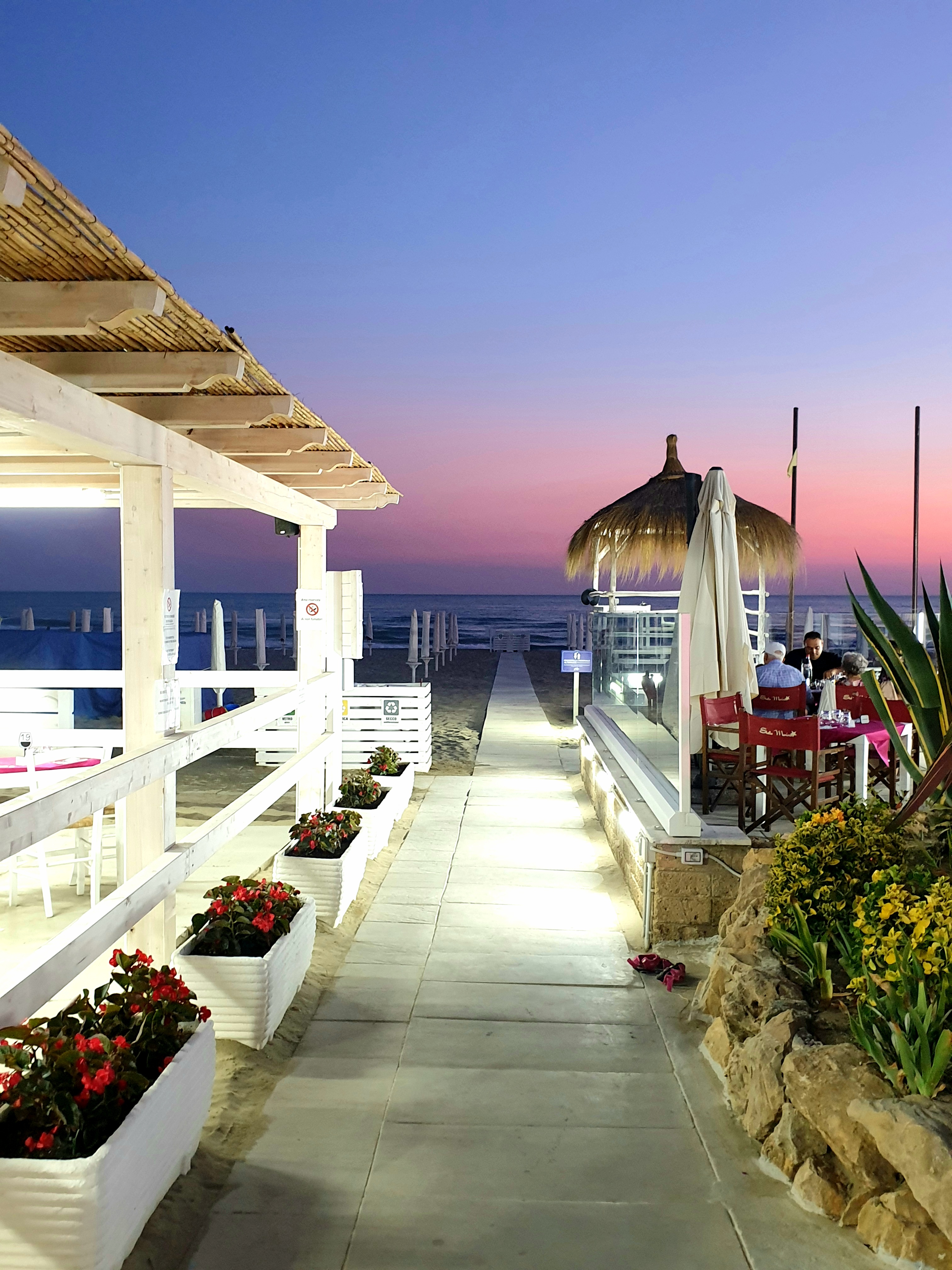 Ci ha colpito innanzitutto la location all’aperto in particolare per le coperture a flogie di palma nella veranda dedicata alla ristorazione, che creano un’atmosfera esotica. A queste si aggiungono varie piante, fiori e ovviamente la vista del mare, che al tramonto in particolare è spettacolare. Il locale presenta anche un ampio spazio al chiuso che però durante il Covid e la stagione estiva non viene utilizzato. I tavoli apparecchiati sono quindi all’esterno dove è anche più carino l’ambiente.