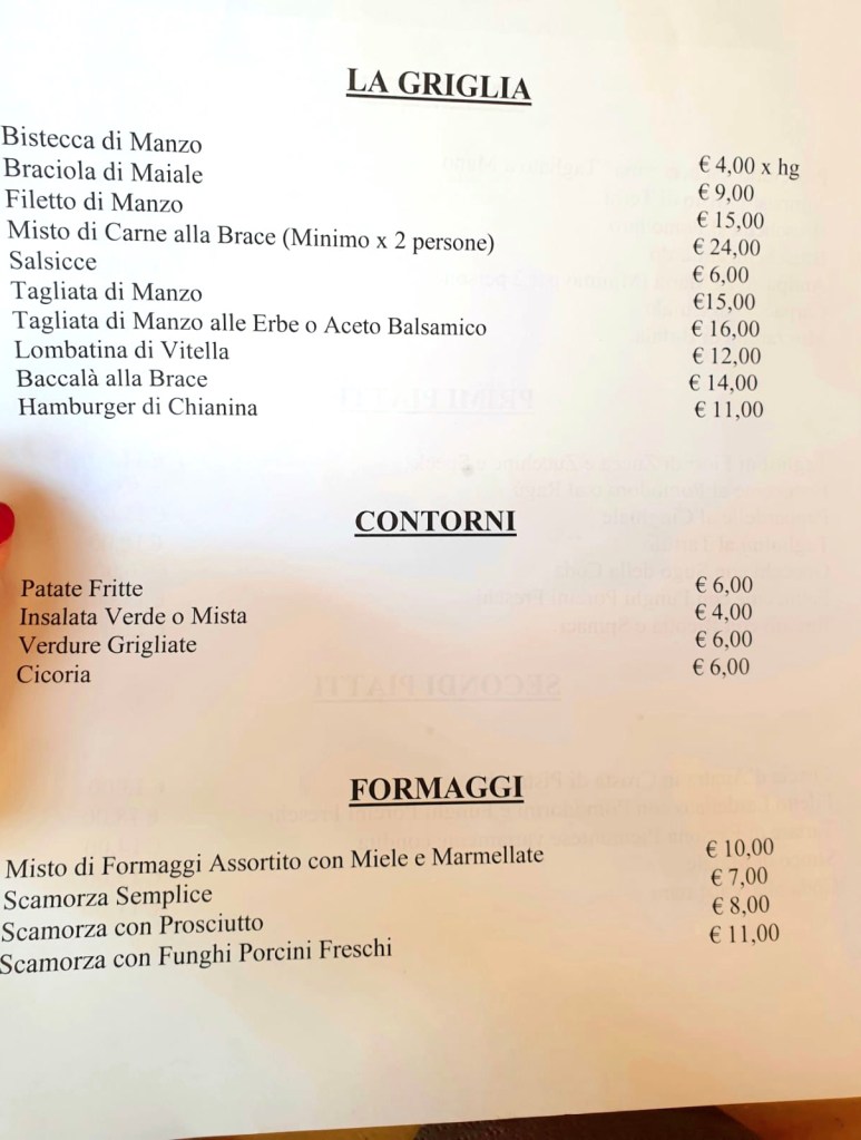 Questo ristorante offre dei primi piatti preparati con pasta fresca fatta in casa, tra i quali vi suggeriamo i tagliolini al tartufo (18 euro) e le fettuccine ai funghi porcini (13 euro). Oltre a essere state colpite da un bell’impiattamento, li abbiamo trovati entrambi molto buoni. Qui sotto potete consultare il menù completo con gli altri primi offerti.