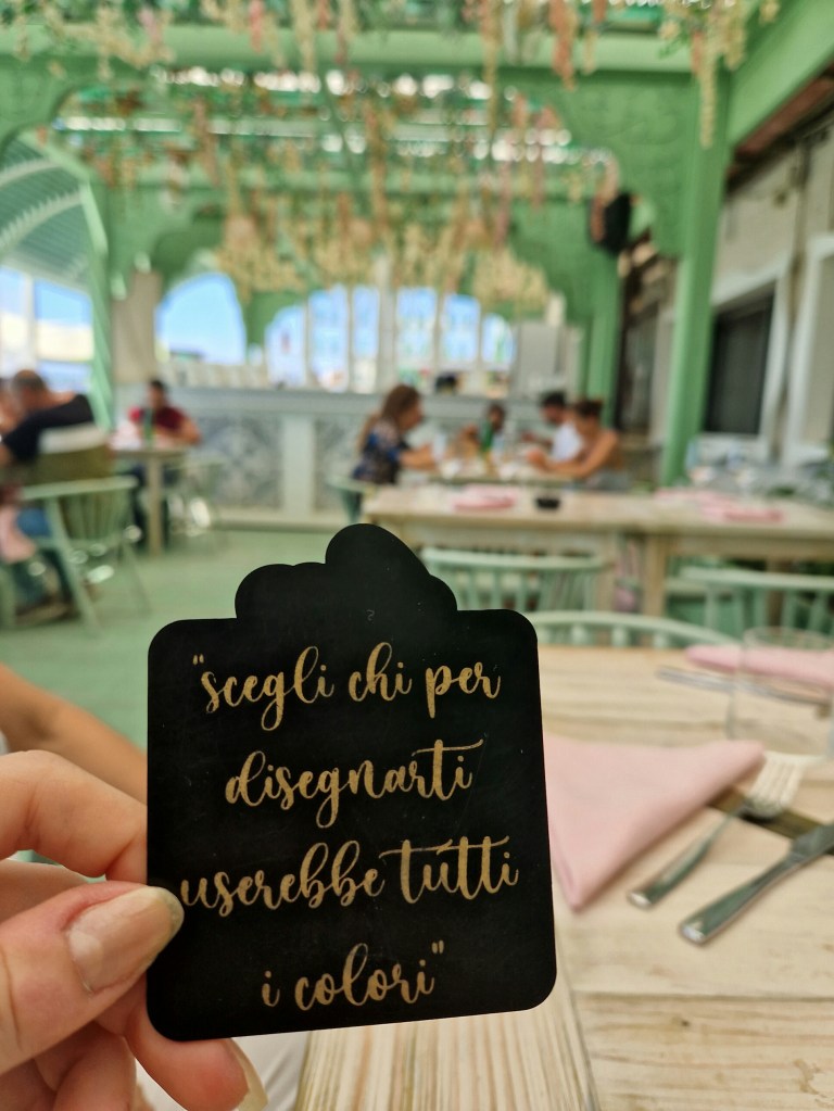 Colpite dallo stabilimento, non potevamo non provare anche il ristorante. Una piacevole scoperta è stata la location: affaccia proprio sulla spiaggia tramite una bella veranda in legno color verde acqua decorata con dei fiori che pendono dal soffitto. Abbiamo notato anche altri piccoli dettagli, come le targhette dorate con la frase del giorno e il logo del locale su ogni posto a tavola.