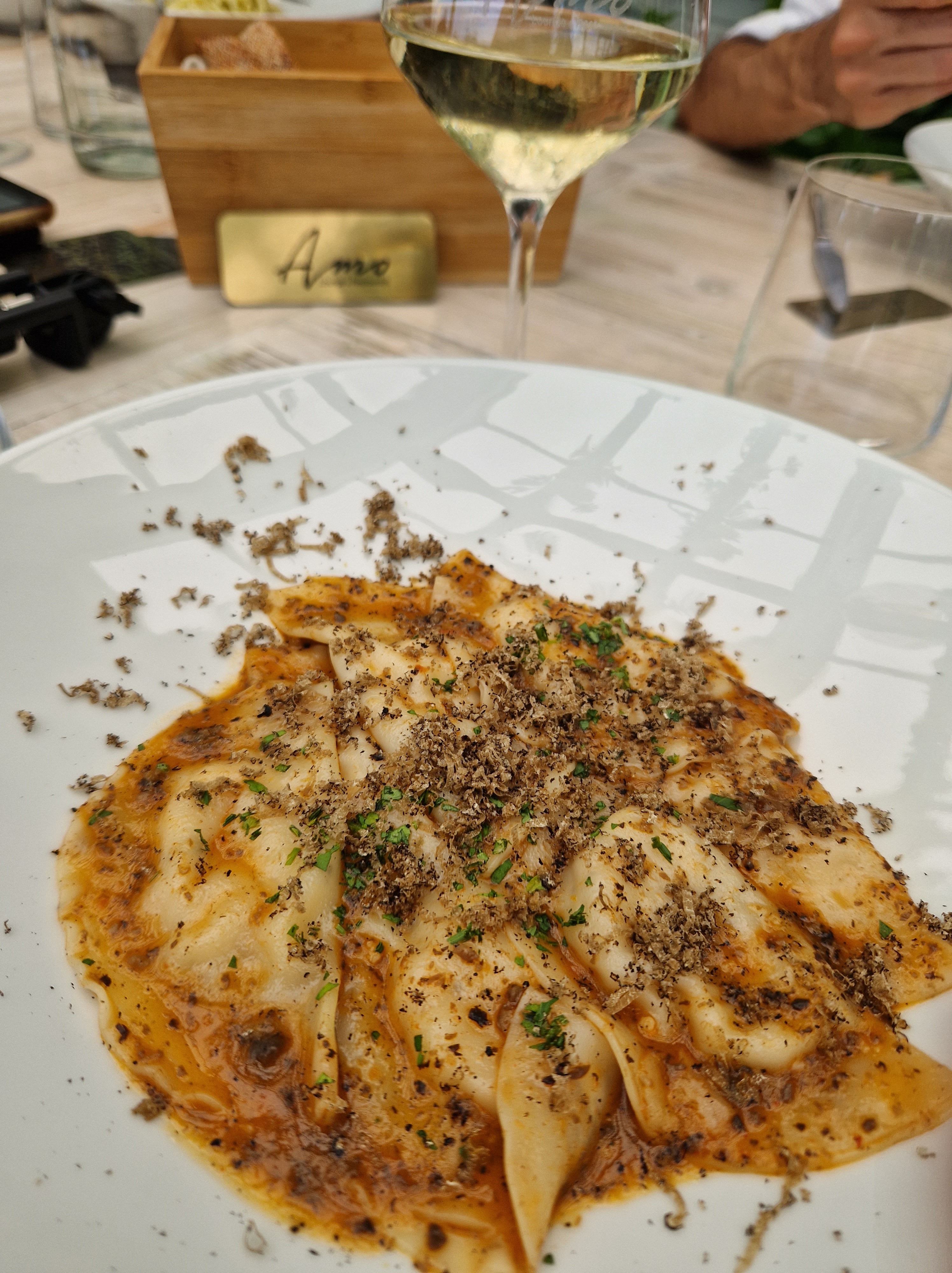Per il pranzo, a base di pesce, vi consigliamo in particolare alcuni primi: piatto di Mezzaluna acqua e farina ripieno di gamberi e bufala, mantecato con bisque di crostacei, tartufo nero pregiato (20 euro) e i paccheri con pesce spada, melanzane, pecorino romano dop e peperone crusco (18 euro). I piatti sono buoni e originali, anche se le porzioni non sono particolarmente abbondanti (in particolare ci riferiamo al piatto di mezzaluna). Tra le cose che non ci hanno convinto invece c’è la frittura di calamari e gamberi (20 euro), soprattutto per la panatura esterna che si staccava facilmente. I prezzi sono abbastanza alti.