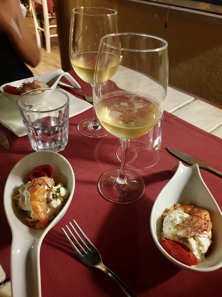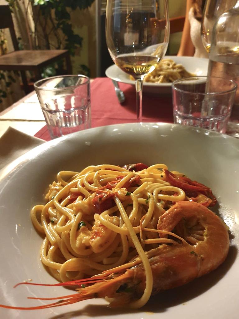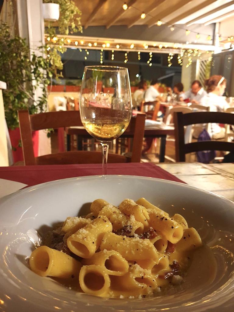 Il locale offre sia piatti di mare che di terra: noi li abbiamo provati entrambi, così da avere una visione più ampia. Ci hanno offerto innanzitutto gli antipasti, molto sfiziosi ed eleganti: gamberi rossi con pomodorini confit e stracciata e tartare di salmone affumicato e avocado, presentato sotto un coperchio di vetro per non disperdere il fumo. Tra i primi abbiamo assaggiato la famosa carbonara (11 euro), che ha la fama di essere la migliore di Roma. Effettivamente era davvero buona! Forse avremmo preferito che il guanciale fosse più morbido, ma il sapore era buono. Un altro primo che abbiamo trovato particolare è quello con cacio e alici. Abbiamo provato anche un altro piatto dal gusto più semplice: gli spaghetti con gamberi, pomodori e stracciata. Tutti i piatti erano abbondanti e la presentazione ottima come potete vedere dalle foto!