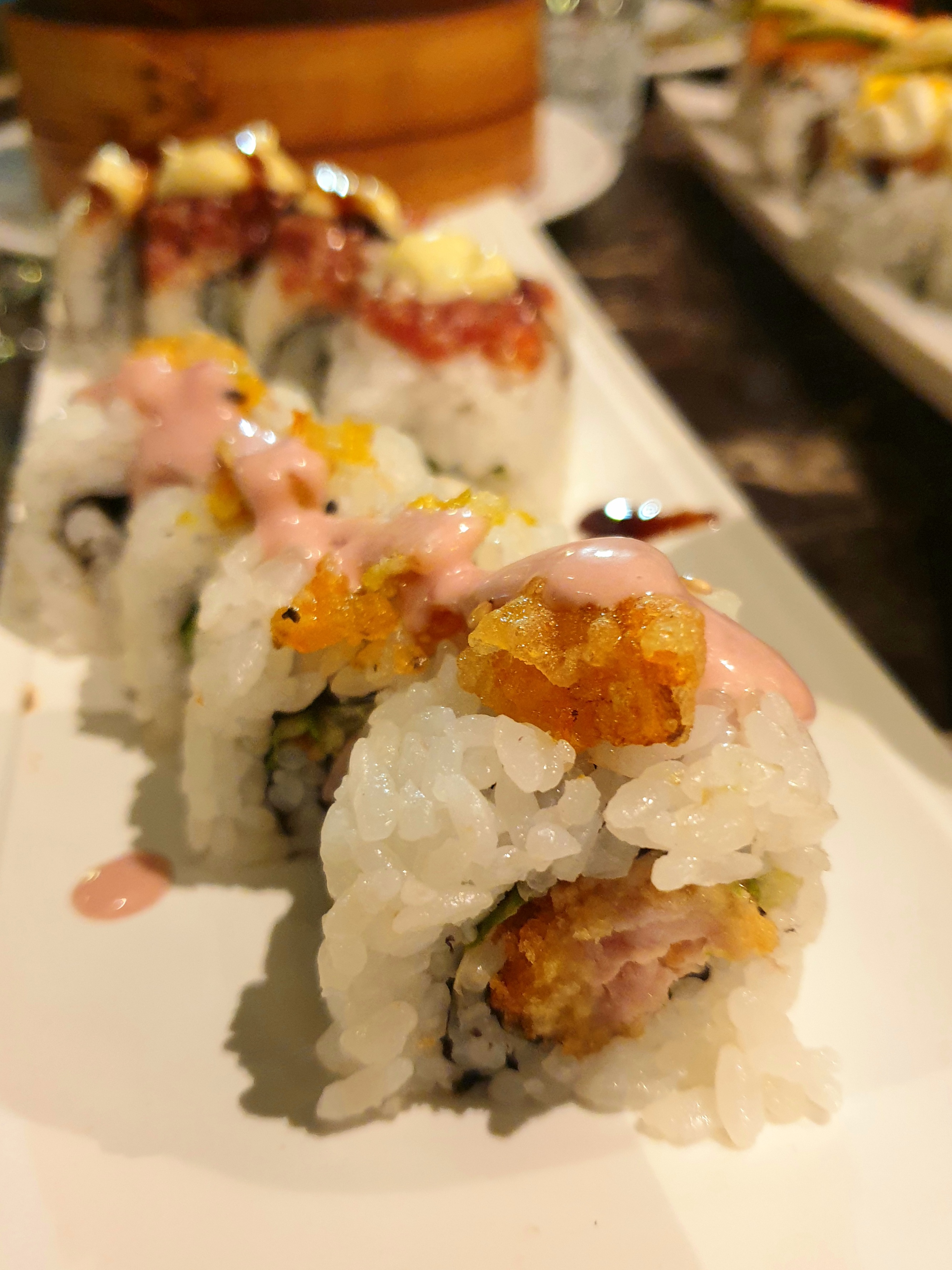 Per la parte sushi la categoria che abbiamo trovato ancora più sfiziosa e interessante è quella degli Uramaki, decisamente i nostri preferiti della serata. Parliamo in particolare degli Uramaki Miura con salmone cotto, pasta kataifi, avocado, tobiko avocado e i Chips Ura con salmone scottato, tempura di gambero, avocado, chips di patata, spicy mayo. L’irresistibile croccantezza è sicuramente un punto a loro favore. Nella foto ci sono anche i Rucola Roll (gamberi in tempura, salmone, rucola fritta, mayo spicy, alghe, riso) e gli Uramaki Green (gamberi tempura, avocado, mayo).