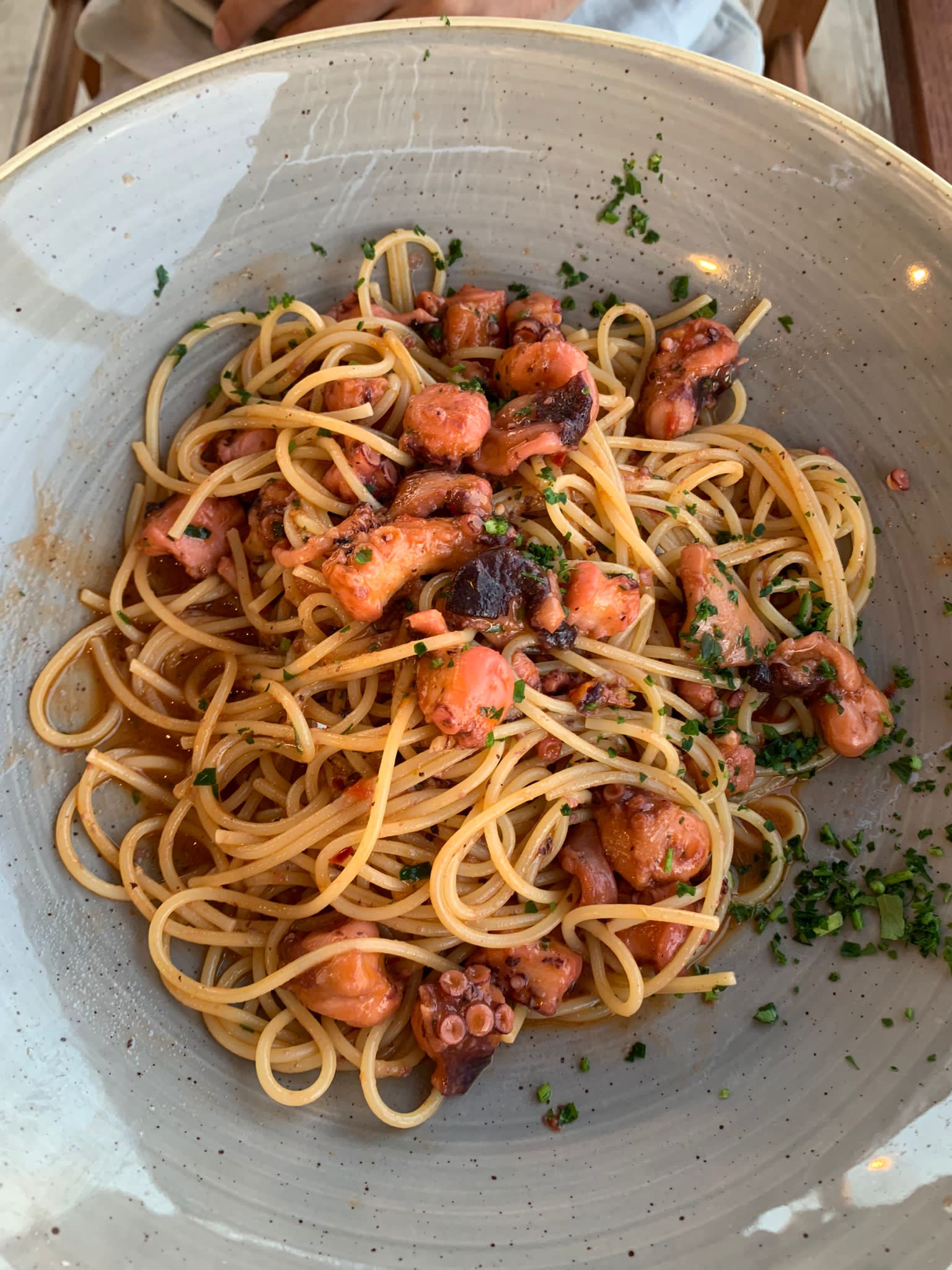 Abbiamo trovato molto buono il pesce sia nei primi piatti, ovvero gli spaghetti ai polpi (18 euro) e le fettuccine alla pescatora (18 euro) che nella grigliata mista di pesce (15 euro a testa) accompagnata da un’insalata con le acciughe. Le porzioni erano abbondanti e la presentazione ottima. Siamo rimaste soddisfatte anche del servizio in generale, che è stato abbastanza rapido.