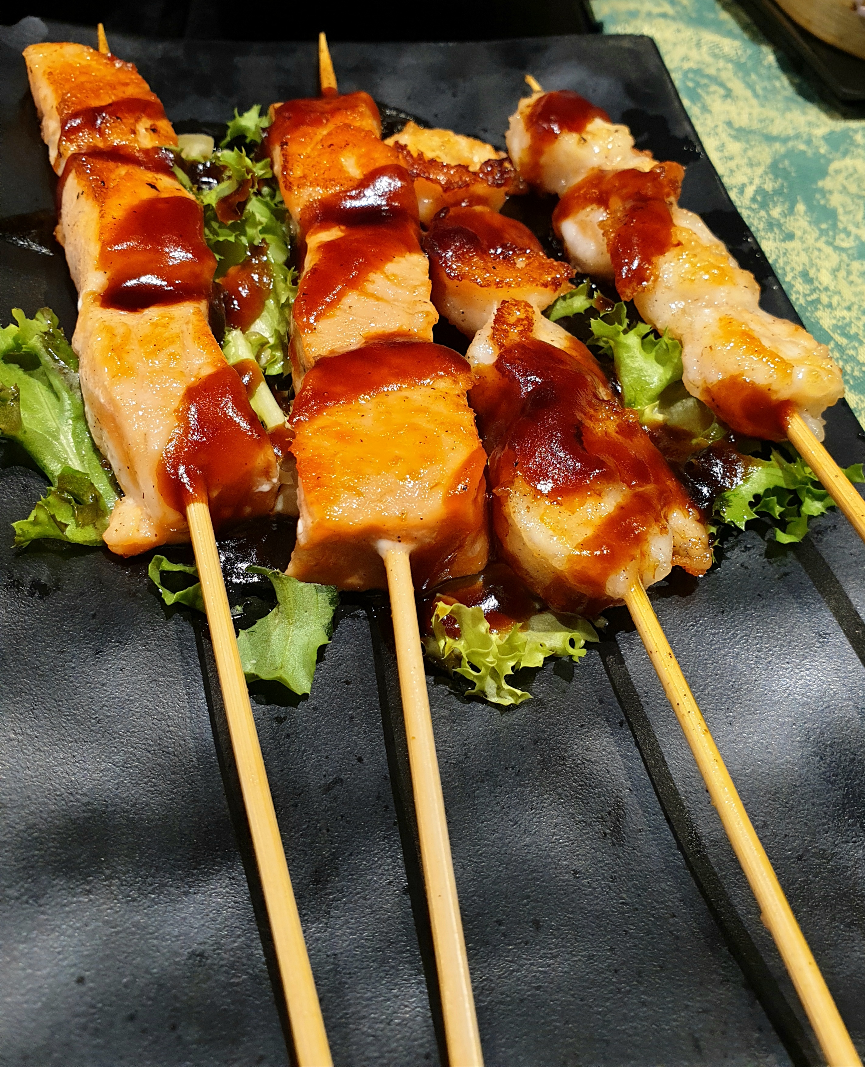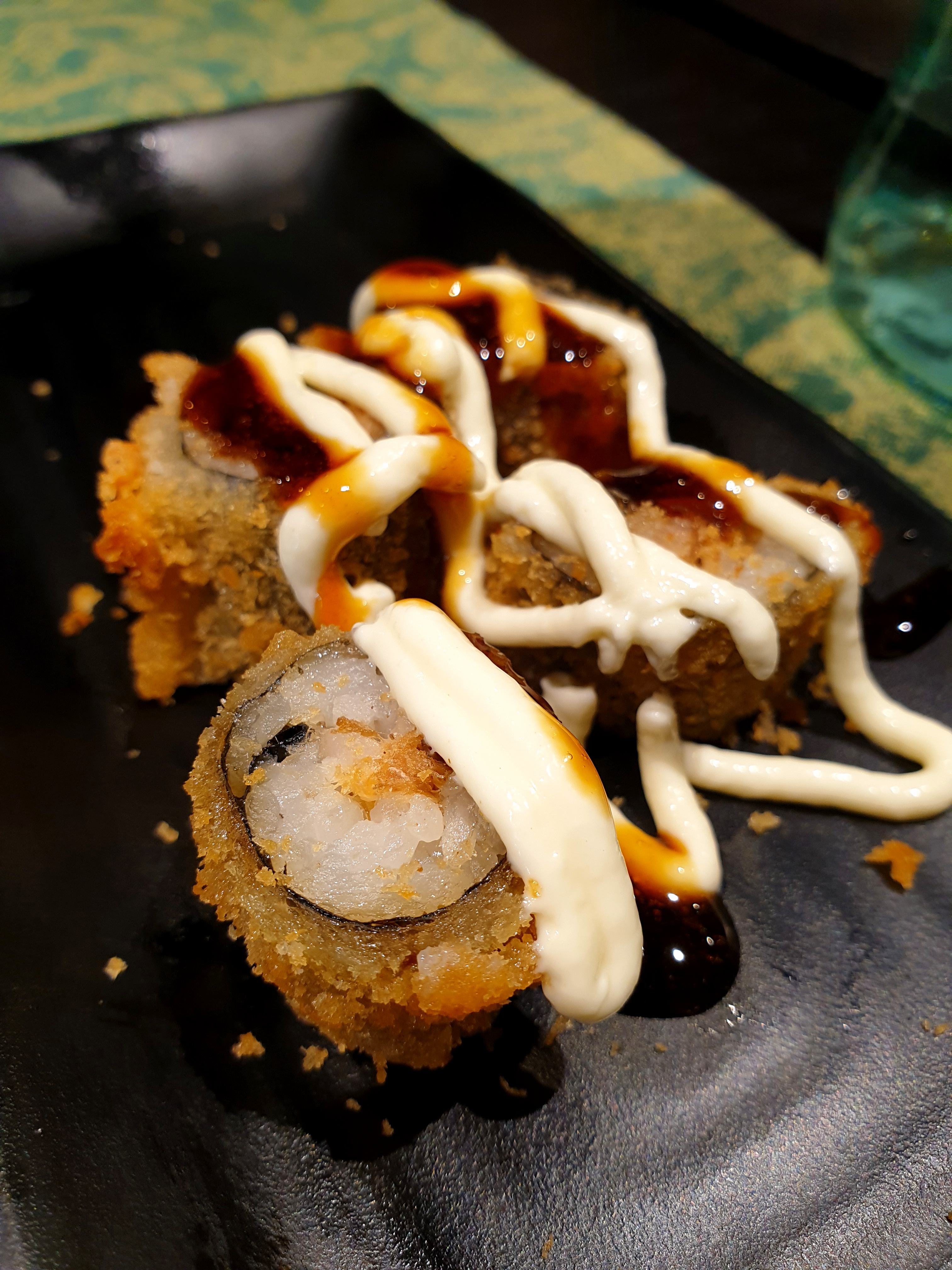 Le proposte dell’All you can eat (prezzo 18,90 euro a pranzo e 24,90 euro a cena) ci sono sembrate interessanti così come abbiamo apprezzato molto la presentazione dei piatti. Dopo i classici ravioli al vapore (Niku gyoza) e involtini di verdure (Yasai Harumaki), immancabili, siamo passati al sushi: patata dolce in tempura con avocado, cipolla croccante e salsa è tra i nostri preferiti continuando con il Salmon philadelphia (salmone, formaggio fresco e sesamo) e Ebi guacamole (gamberi in tempura, guacamole, kataifi, salsa). Per chi preferisce il salmone cotto si va dal più semplice Tempura maki ad alternative più particolari e innovative con avocado, formaggio fresco, salmone scottato alla fiamma, al pistacchio (Sake pistacchio) o alle fragole (Strawberry Sake). Abbiamo assaggiato anche delle varianti particolari come il Green jo (zucchine alla piastra, salmone cotto, formaggio fresco, pistacchio e salsa) e il Mandorle jo (salmone cotto con scaglie di mandorle e formaggio). Anche gli spiedini di pesce (Salmon yaki e Ebi yaki) sono buoni. Per chi invece si vuole avventurare con la carne abbiamo deciso di sperimentare la tartare manzo e tartufo, prima volta per noi, ma non ci ha molto convinto. Infine consigliamo per cambiare e assaggiare qualcosa di più fresco la Veggie salad (insalata, mango, chia, salsa).