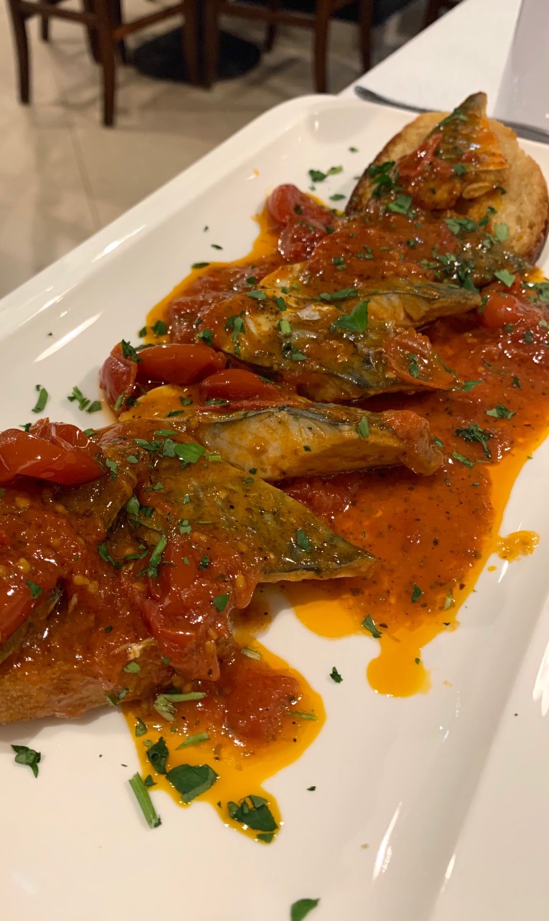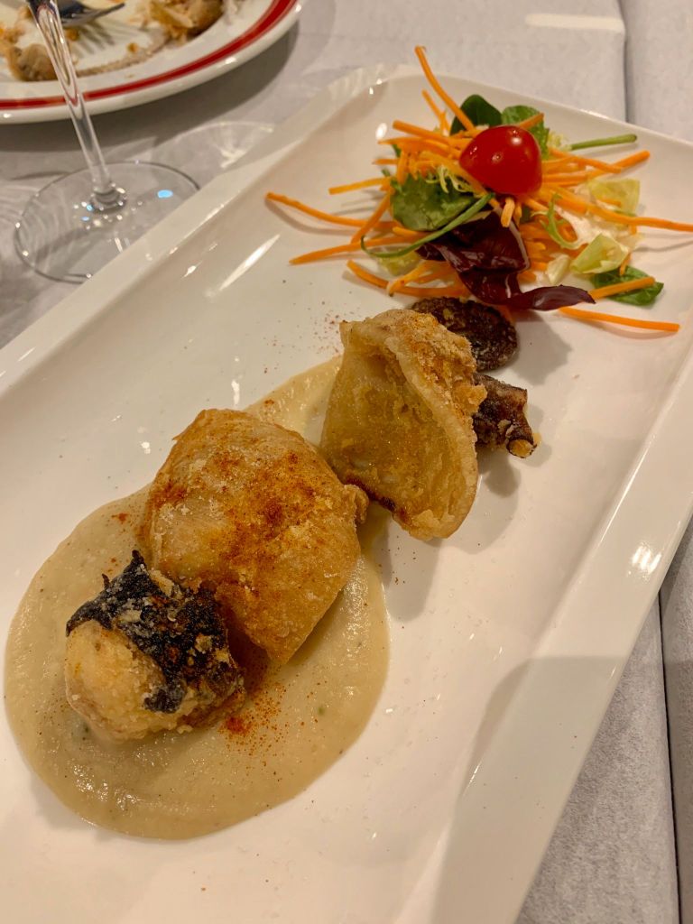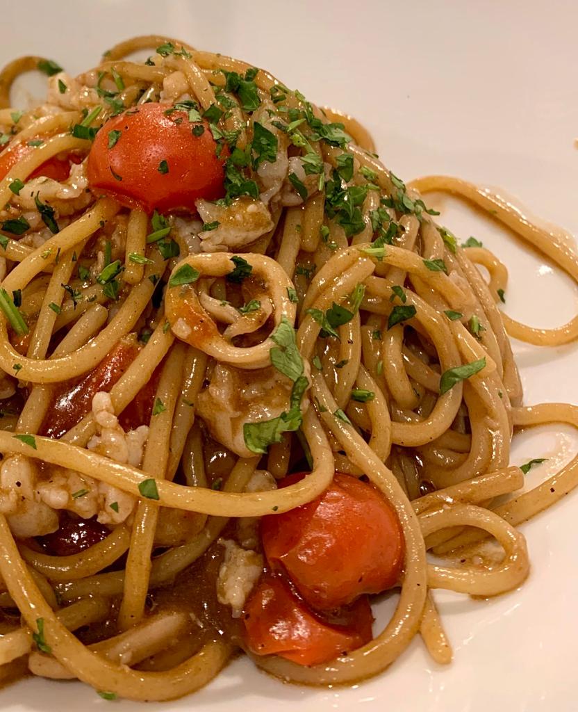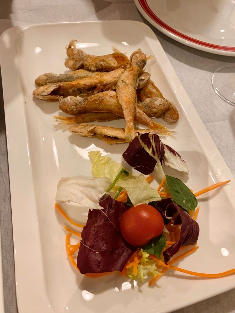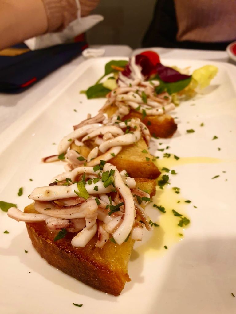 Abbiamo assaggiato un pò tutti i piatti forti del locale a partire da uno sfizioso antipasto con trigliette di Anzio fritte, bruschette con i totani e polpo croccante su crema di cannellini. Il piatto preferito della serata è stato quello con gli spaghetti con gambero rosa di Anzio, totani ed aglio nero (15 euro), dal sapore particolare e molto gradito. A seguire abbiamo finalmente provato il pescato del giorno: per noi è stata la prima esperienza con l’Ala di razza alla griglia e patate pasticciate alla paprica (16 euro) e i filetti di sgombro arraganati con crostino di pane (14 euro).