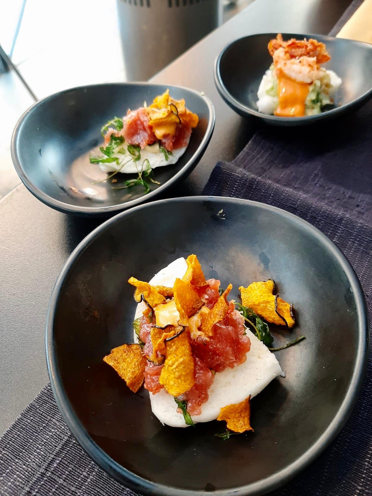 La scelta è molto ampia, potete sbizzarrirvi anche con le tartare: Tuna Tartare (foto a sinistra), ovvero tartare di tonno con mango e caviale tobiku, emulsione di ponzu, erba cipollina e germogli di shiso) oppure tartare con chips di zucca sopra al pane cotto al vapore (foto al centro).