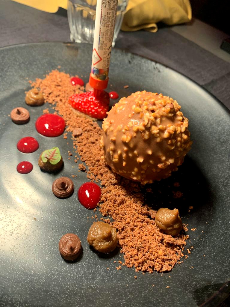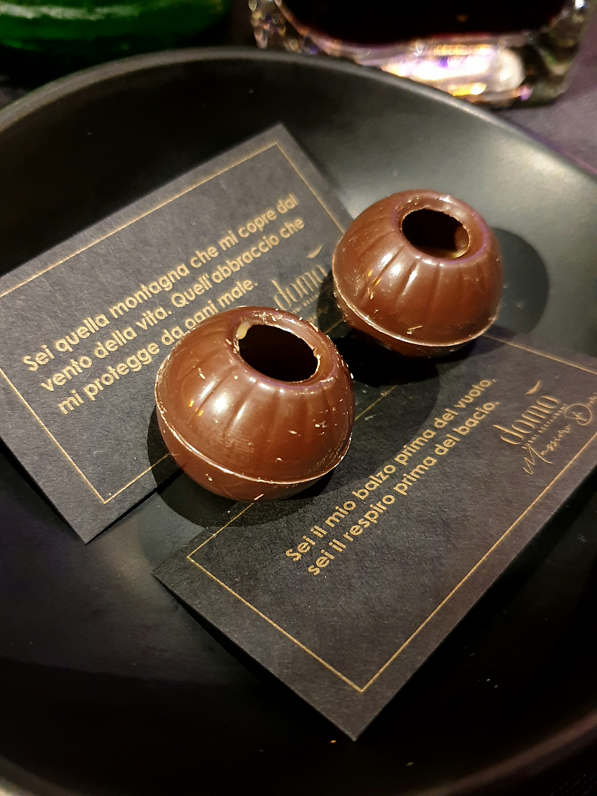 Per finire dolcemente la serata sono arrivate la cheesecake alle fragole e il loro Rocher con mousse alla nocciola e pralinato, dacquoise alla nocciola e glassa, buonissimi e dall’ottimo impiattamento. Super novità del locale: i cioccolatini Domò accompagnati da varie frasi poetiche a sorpresa.