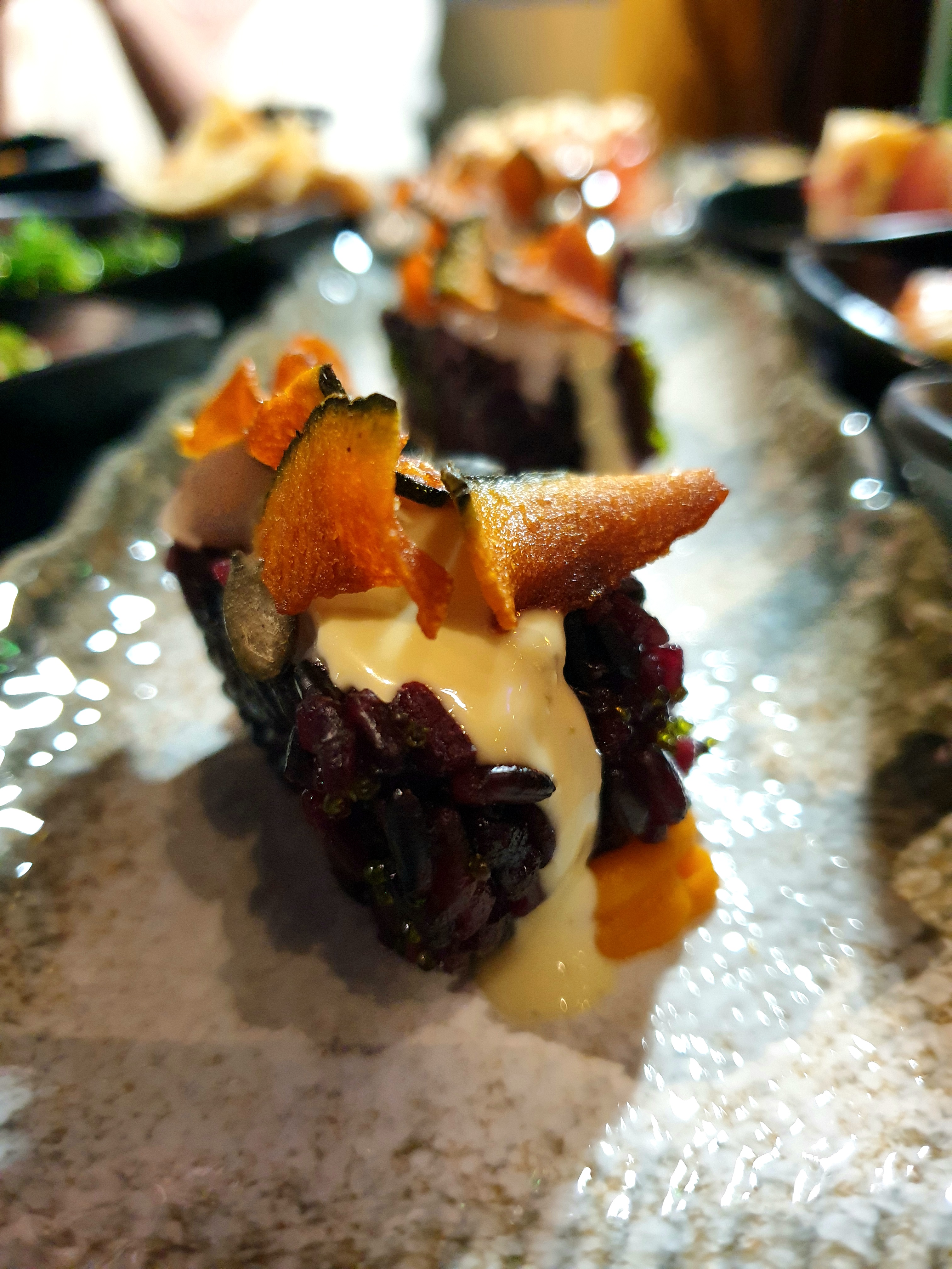 Altre novità della nostra ultima visita: i Nigiri di salmone scottati direttamente al tavolo e i Black Gunkan, roll fresco e gustoso con tartare capesante, zucca e riso nero al caviale, ci sono piaciuti molto.