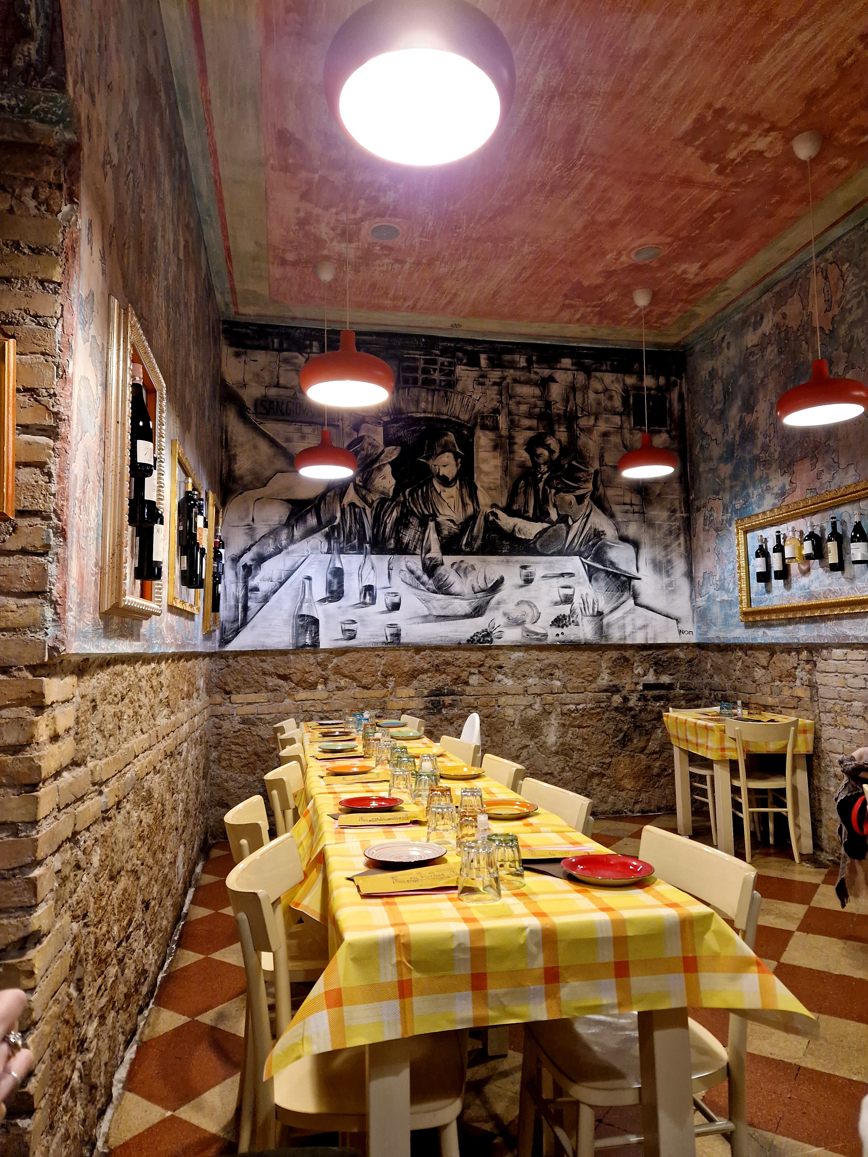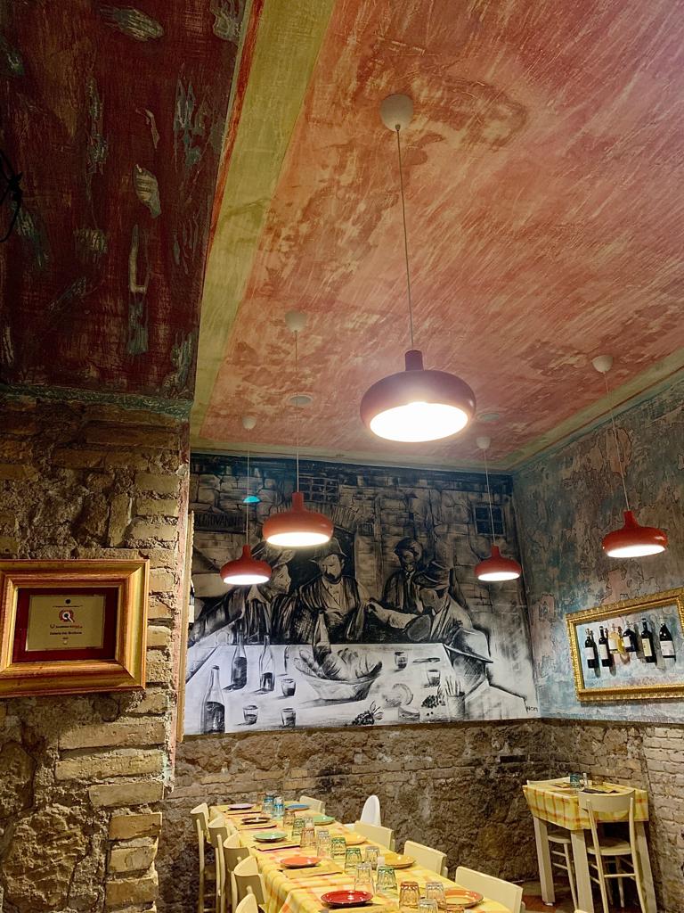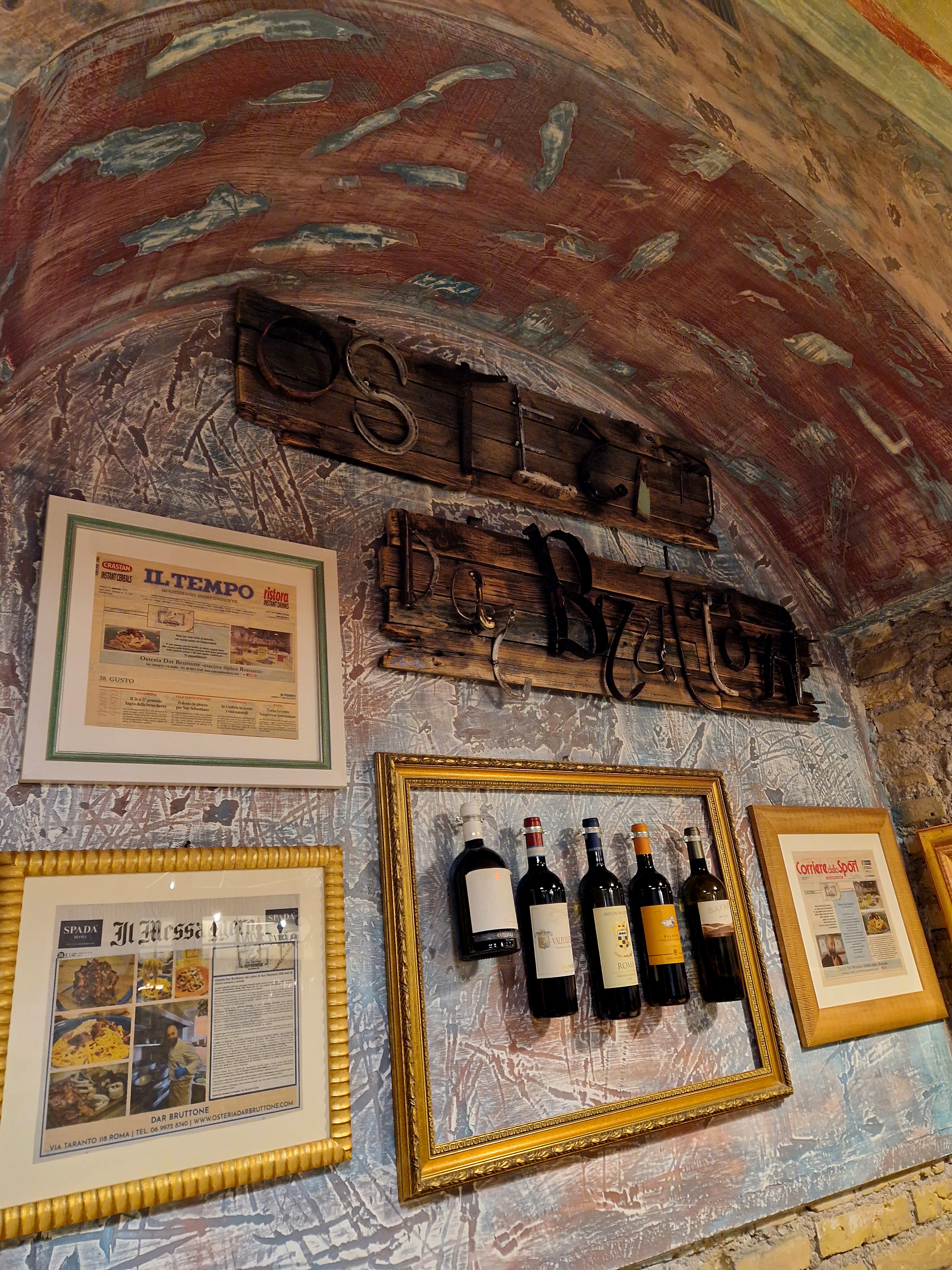 Questa volta siamo andate a provare un ristorante di cucina romana in zona Re di Roma. Parliamo di Dar Bruttone, un posto accogliente e tranquillo con lo stile e l’atmosfera tipici dell’osteria. L’accoglienza calorosa dell’oste Giuseppe e la disponibilità del personale ne sono la prova. Ci sono piaciuti anche alcuni dettagli del locale: la scritta “Osteria dar bruttone” composta da vari utensili, i quadretti con le bottiglie di vino appese e le pareti per metà in mattone.