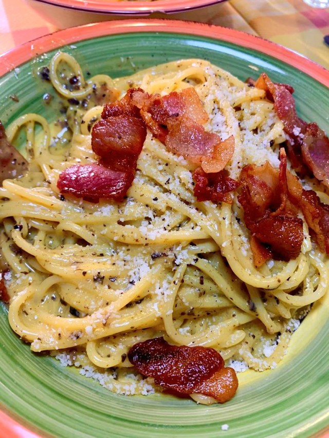 Arriviamo ai primi della serata, partendo con un classico della cucina romana: la carbonara TOP (10 euro) molto cremosa e gustosa. Stavolta l’abbiamo provata pure nella versione tartufata (12 euro), originale anche se forse copriva un pò il sapore della carbonara stessa che ci piace tanto. Altre specialità che abbiamo provato, dal gusto più semplice: Tortelloni cacio e pepe ripieni di carciofi (12 euro), Fettuccine fatte in casa con ragù di cinghiale al sugo (12 euro), Gricia con i carciofi (9 euro). Porzioni dei piatti tutte abbondanti. Come degna conclusione della cena non potevano mancare i dolci (tutti 5 euro), anche questi molto apprezzati: tiramisù, crema catalana e cheesecake ai frutti di bosco.