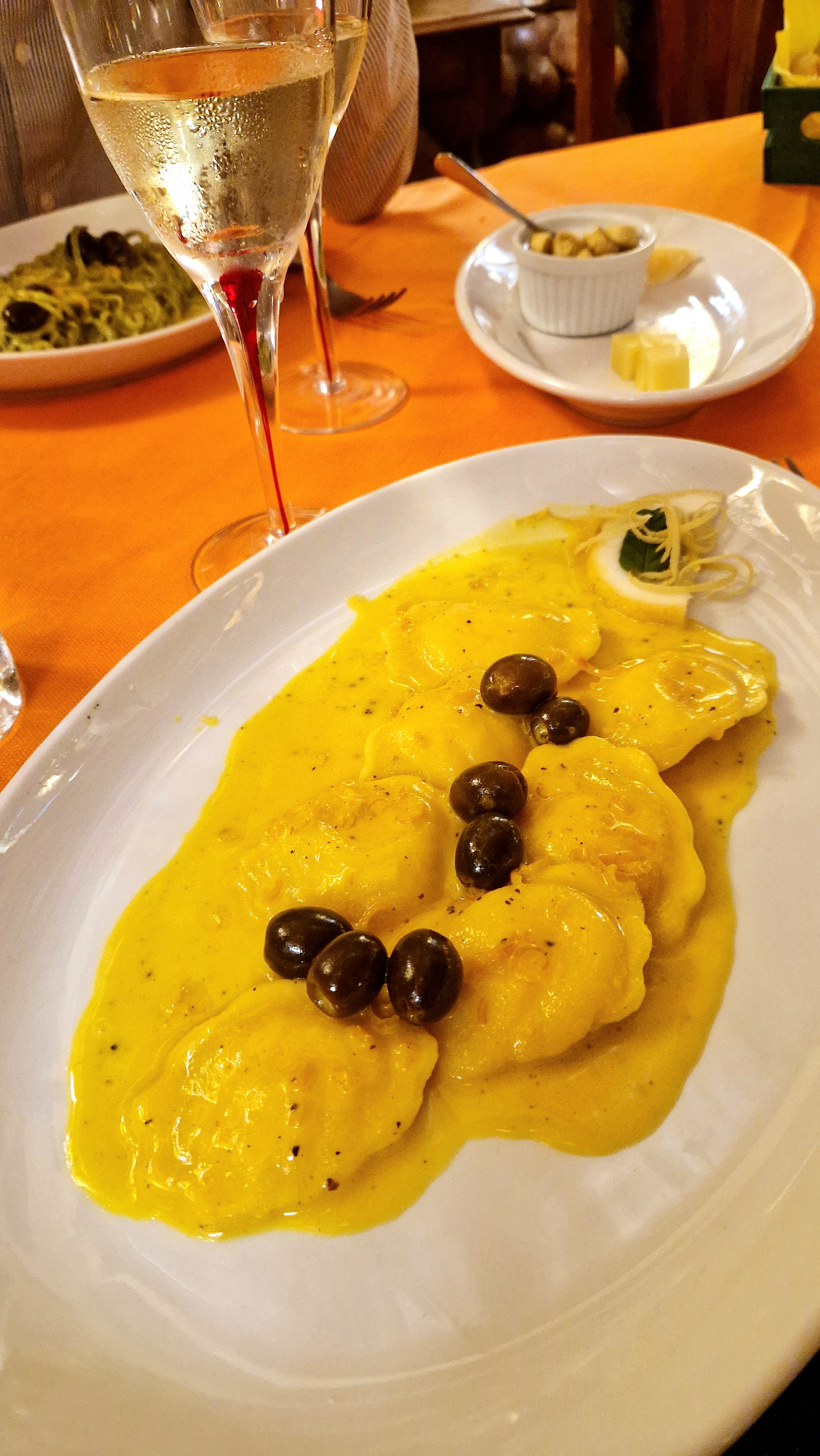 Noi abbiamo sperimentato sia i ravioli ripieni di ricotta che i tagliolini con crema di zafferano, limone e olive. Entrambi i piatti sono appetitosi e particolari, anche se forse avremmo preferito che il sapore del limone, piuttosto predominante, risultasse più attenuato.