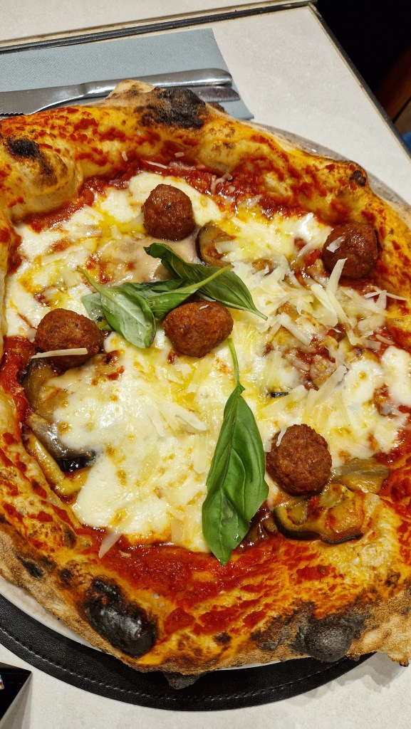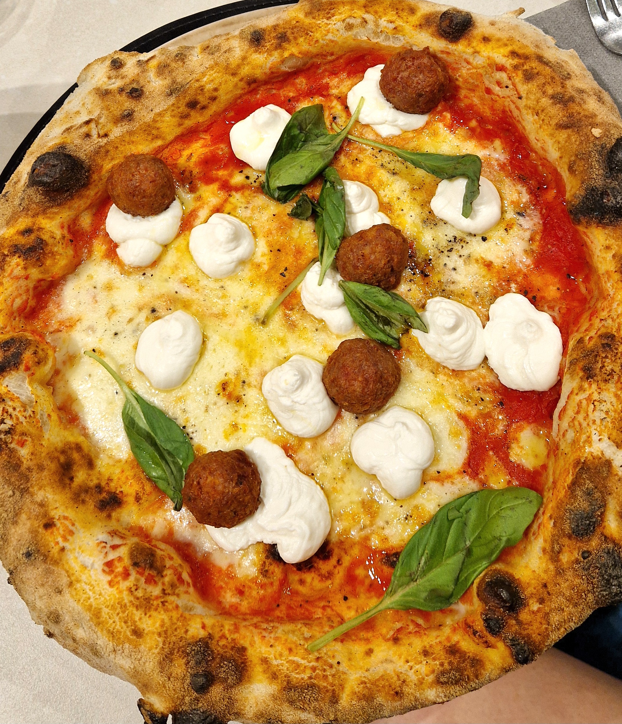 Se volete sfidare il vostro stomaco, ci sta anche “Abbraccio e mammà” con cornicione ripieno di ricotta dei monti, base con fiordilatte dei monti, polpettine classiche di nonno Enzo, fonduta di grana padano, mozzarella di bufala dop, olio e basilico.
